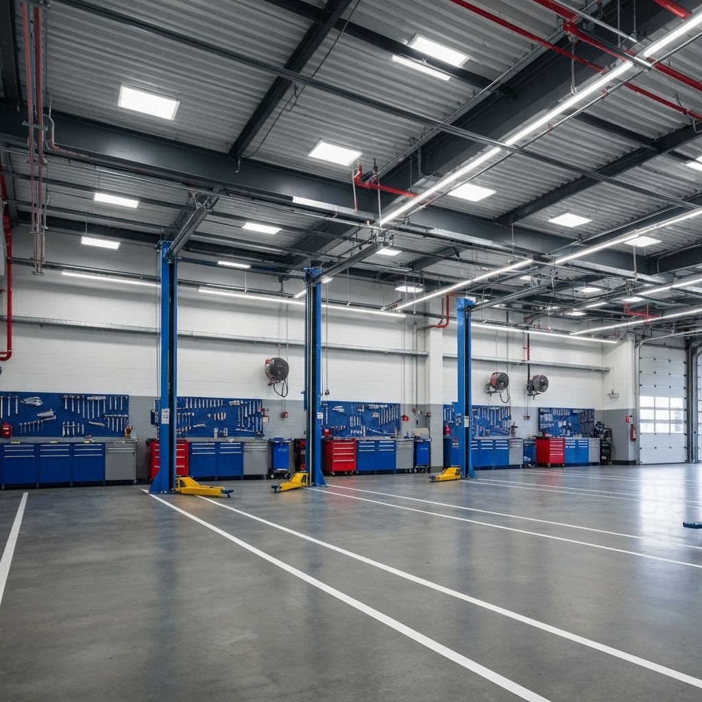 Complete LED lighting conversion for a 10-bay auto repair facility, high-CRI fixtures delivering optimal visibility for precision automotive work with 60% energy reduction.