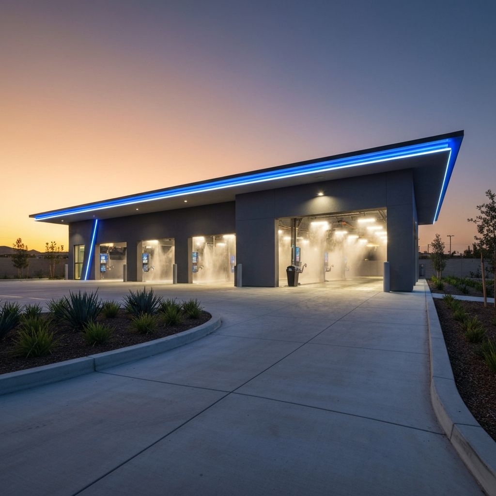 Coordinated LED lighting conversion across four car wash locations, waterproof tunnel fixtures, bay lighting, and exterior signage delivering 55% energy reduction.